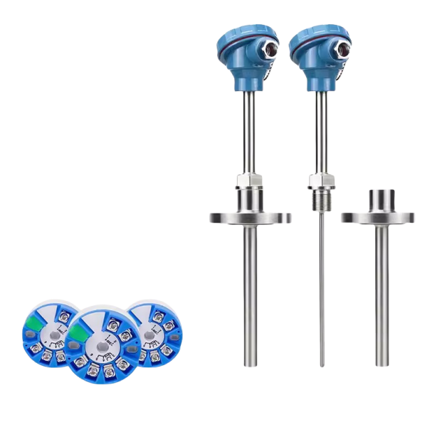 帶熱電偶或帶熱電阻溫度變送器是DDZ-S系列儀表中的現(xiàn)場安裝式溫度變送單元。它集熱電偶或熱電阻同變送器為一體,直接測量各種工業(yè)過程中-200~1600℃范圍內(nèi)的液體、蒸汽和氣體介質(zhì)的溫度,將溫度轉(zhuǎn)變成與熱電偶、熱電阻電信號成正比的4~20mA統(tǒng)一輸出信號,送顯示、記錄調(diào)節(jié)儀表或計算機。作為新一代的溫度變送器,它可廣泛用于冶金、石油、化工、電力、輕工、紡織、食品、國防及科研等各部門。