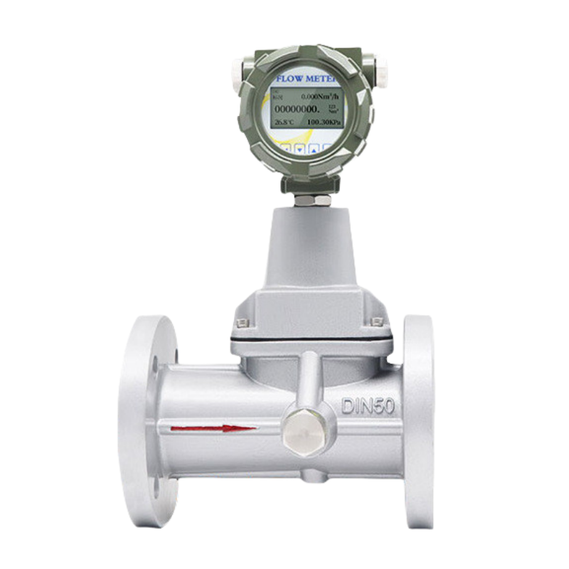 流量傳感器的流通剖面類似文丘利管的型線。在入口側(cè)安放一組螺旋型導(dǎo)流葉片,當(dāng)流體進(jìn)入流量傳感器時(shí),、導(dǎo)流葉片迫使流體產(chǎn)生劇烈的旋渦流。當(dāng)流體進(jìn)入擴(kuò)散段時(shí),旋渦流受到回流的作用,開始作二次旋轉(zhuǎn),形成陀螺式的渦流進(jìn)動(dòng)現(xiàn)象。該進(jìn)動(dòng)頻率與流量大小成正比,不受流體物理性質(zhì)和密度的影響,檢測(cè)元件測(cè)得流體二次旋轉(zhuǎn)進(jìn)動(dòng)頻率就能在較寬的流量范圍內(nèi)獲得良好的線性度。信號(hào)經(jīng)前置放大器放大、濾波、整形轉(zhuǎn)換為與流速成正比的脈沖信號(hào),然后再與溫度、壓力等檢測(cè)信號(hào)一起被送往微處理器進(jìn)行積算處理并在液晶顯示屏上顯示出測(cè)量結(jié)果(瞬時(shí)流量、累積流量及溫度、壓力數(shù)據(jù))。
